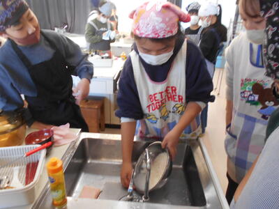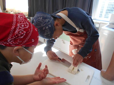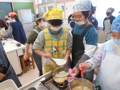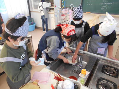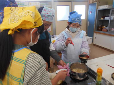 北校舎1階の廊下を歩いていると、ふわりとお出汁の良い香りが漂ってきます。香りに誘われ家庭科室をのぞいてみると、5年生が「ご飯と味噌汁」の調理実習をしているところでした。