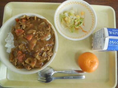 <今日の給食は、冬野菜のカレー、白菜サラダ、みかん、と季節感たっぷりのメニューでした。冬野菜のカレーには、じゃがいも代わりにダイコンとレンコンが入っていました!>