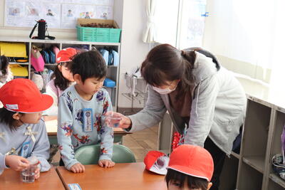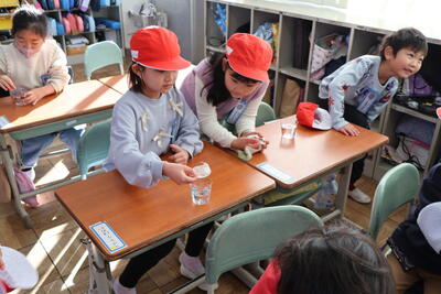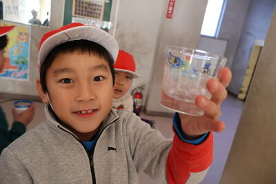 教室に帰りながら「凍るのと凍らないのがあるんだね。凍った人はどこに置いていたの?」と聞いてみると「あっちの方。校舎の影になるところ」と教えてくれました。「凍らなかったのはなんでかな?」と聞いてみると「太陽があっちから当たっていたのかもしれない」と1年生ながらに考えて答えてくれました。