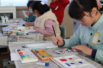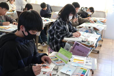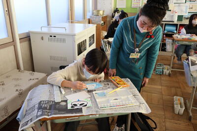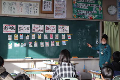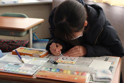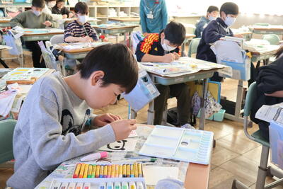 1月26日(月)壬生町で校長先生としてお勤めしていた先生をお迎えして、5年生が絵手紙教室を実施していただきました。受け取った人が喜んでくれるように、心を込めて丁寧に楽しく作ることが大切と導きいただきました。この2時間のめあては「楽しくやる!お気に入りを作る!」ということでスタート!!子供たちは真剣な表情で「何を描こうかな?何色にしようかな?」と悩みながら進めていました。