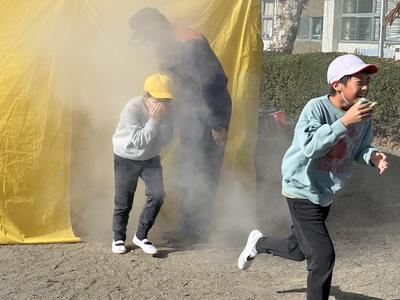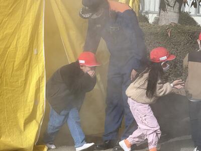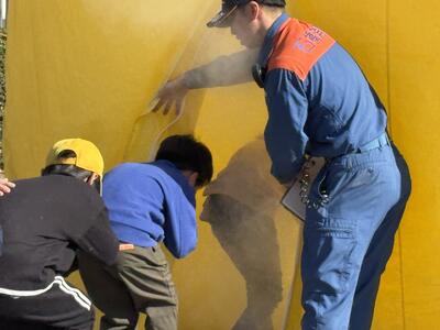 その後消防士さんの指導のもと、【煙の中を安全に移動するための煙道体験】や【水消火器の使い方講習】を行いました。