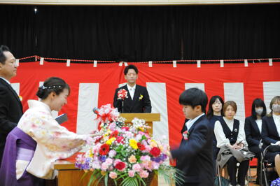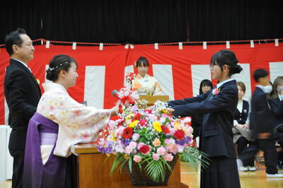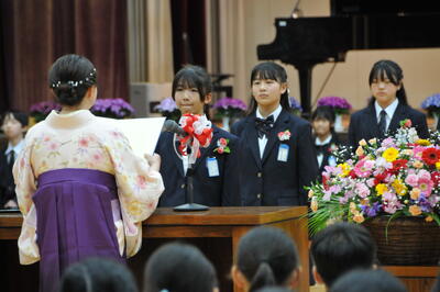 続いて、児童から花束をお渡しすると、