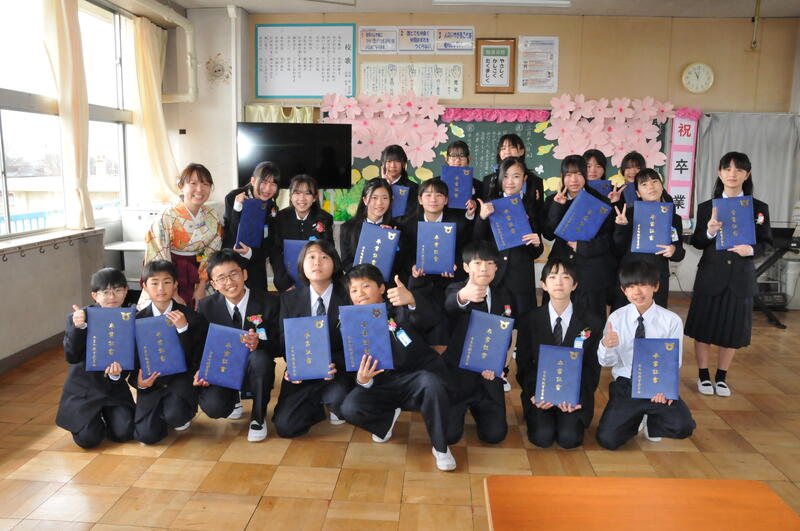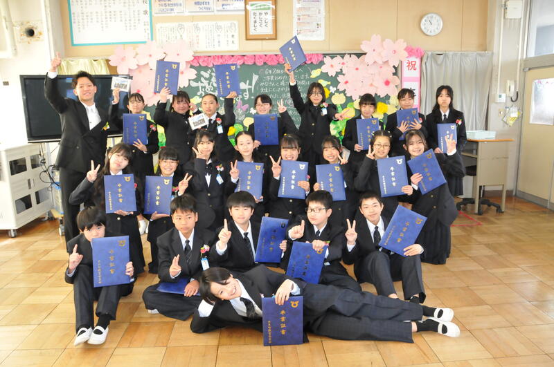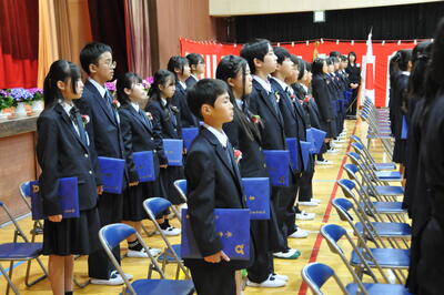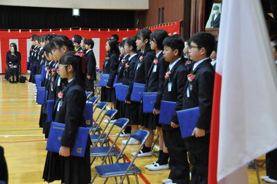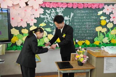 学校長式辞「1162、何の数字か分かりますか?小学校で過ごした日数です。(中略)・・・前向きに挑戦し続けてほしい。上手くいかないときこそ成長する機会。小さな一歩の積み重ねが大きな成長につながるのです。その一つ一つの挑戦が新たな景色に導いてくれます。・・・みなさんの挑戦する姿に幾度となく励まされました。・・・下級生へのメッセージはみなさんの素直な心が表れた温かいものでした。・・・人は支え合い、励まし合い、認め合う中で成長します。その支えに感謝し、つながりを大切にし、人と共に生き人の中で成長していくことを願っています。」
