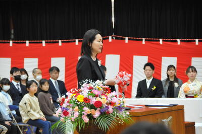 PTA会長祝辞「コロナ禍に入学でしたが、マスク越しに分かる笑顔。できないことを嘆くよりできることを楽しむことができる姿に何度救われたことでしょう。この6年間で工夫する力、思いやる力、前を向く力を身に付けました。この力はこれからの人生でみなさんを支える本物の力となります。中学校生活、ワクワク・ドキドキを存分に楽しんでください。転んでもいい、遠回りしてもいい、失敗してもいい、その度にちゃんと帰ってくる場所がここにあります。幸せに満ちた未来であることを心から願っています。」