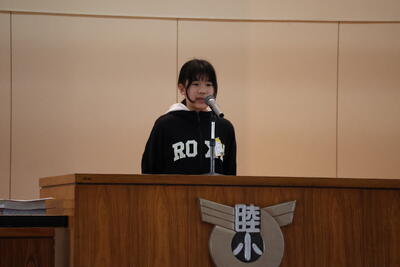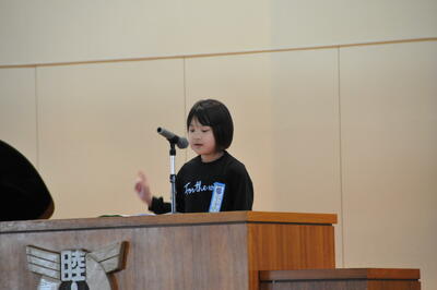 1年生「1つ目は、勉強です。算数のくり上がりの計算が難しかったけどやり方を変えたらできるようになりました。国語の漢字をきれいに書くことができるようになりました。2つ目は、なわとびです。二重跳びの手首を回すのが難しかったけど、いっぱい練習して12回も跳べるようになりました。3つ目は、給食を完食することです。時計を見て意識したり友達と楽しく食べたりして完食できるようになりました。新しい1年生が困っていたら優しく教えてあげたいです。」