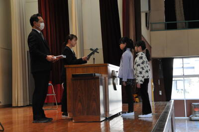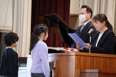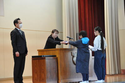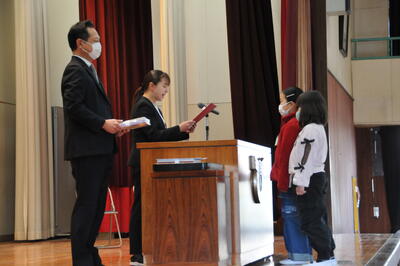 修了証ならびに記念品授与、学年ごとに代表の児童がしっかりとした態度で受け取っていました。