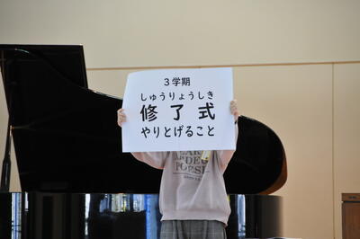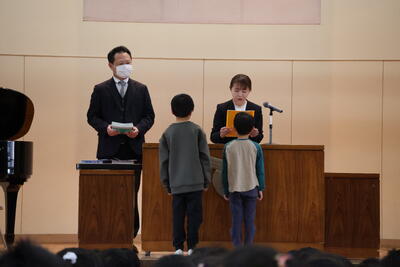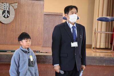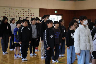校長先生から「修了とは、何かを学び終えたり、やり遂げたりすること。1年間やり遂げた想いが代表作文にたくさん盛り込まれていましたね。みなさんはこの1年間で何を成し遂げたのか、先生やお家の方に話してみてください。そして、みなさんを支えてくださったお家の方、地域の皆様、先生方、仲間・友達に感謝の気持ち「ありがとうございました」と伝えましょう。クラスを締めくくり、4月に元気に会いましょう。」