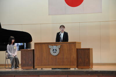 PTA会長祝辞「コロナ禍に入学でしたが、マスク越しに分かる笑顔。できないことを嘆くよりできることを楽しむことができる姿に何度救われたことでしょう。この6年間で工夫する力、思いやる力、前を向く力を身に付けました。この力はこれからの人生でみなさんを支える本物の力となります。中学校生活、ワクワク・ドキドキを存分に楽しんでください。転んでもいい、遠回りしてもいい、失敗してもいい、その度にちゃんと帰ってくる場所がここにあります。幸せに満ちた未来であることを心から願っています。」
