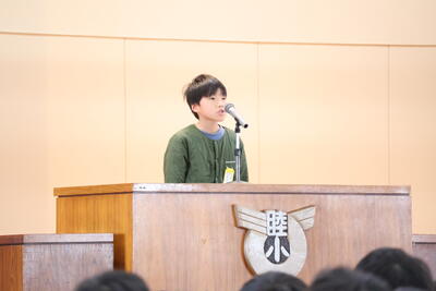 5年生「1つ目は、算数です。位取りが苦手でしたが、算数教室で水・木・金の朝に同じような問題を繰り返し続けて取り組むうちに大きな数の計算もできるようになりました。2つ目は、6年生を送る会です。楽しんでもらえるか心配でしたが、6年生も下級生も楽しそうだったので嬉しかったです。準備は大変でしたが、1つのことをみんなでやり遂げる喜びを感じました。最上級生として頑張りたいです。」