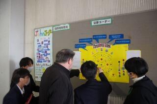 冬休みの予定がまだ決まっていないALTのジョン先生。2年生の英語では、そんなジョン先生に国内のおすすめスポットを紹介する授業でした。紹介するときのポイントは①volume(声の大きさ)②eye-contact(目と目を合わせて)③gesture(身振り手振り)④smile(笑顔)⑤be active!(元気に!)です。みんな一生懸命、プレゼンしています。果たしてジョン先生が行きたくなるスポットは??