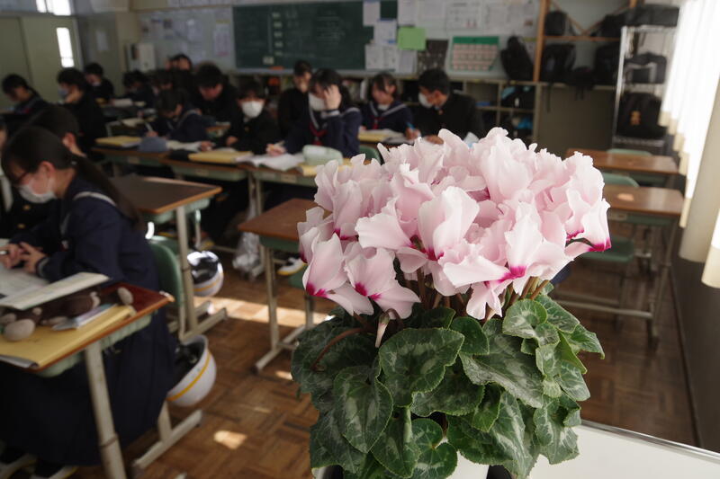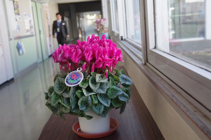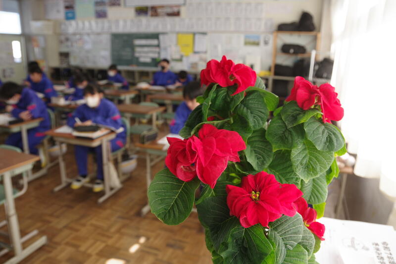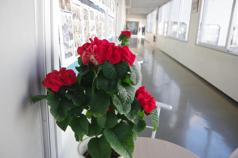 冬本番、クリスマスやお正月も近づいてきました。美化委員の手によって、教室や廊下にはシクラメンやポインセチアが飾られました。学校中が温かい雰囲気に包まれています。2種類とも温度管理等が意外と大変です。大切に育てていきます。