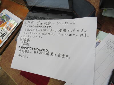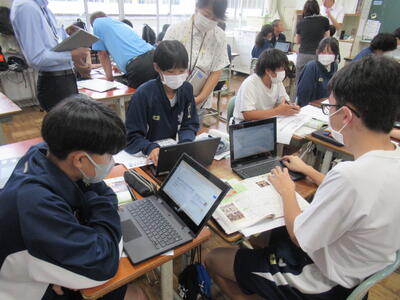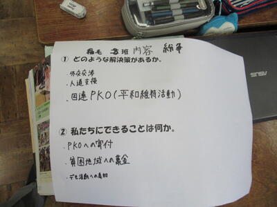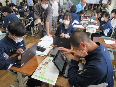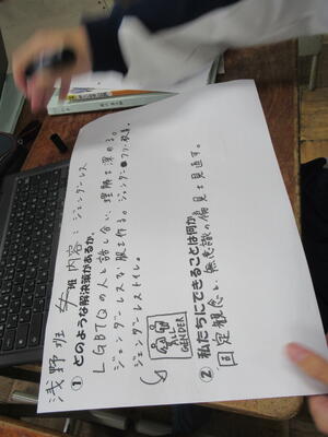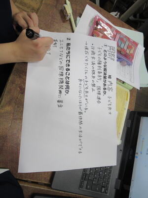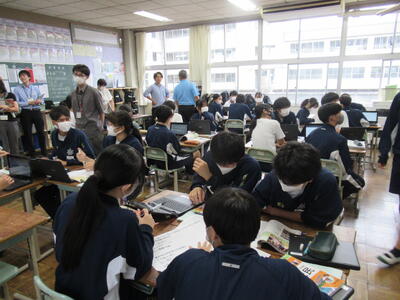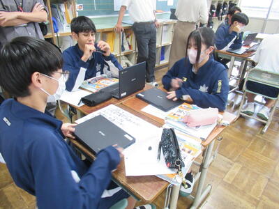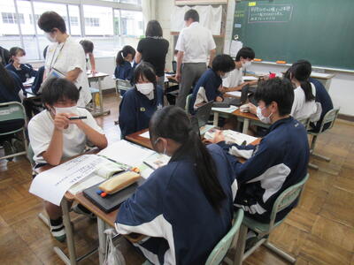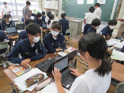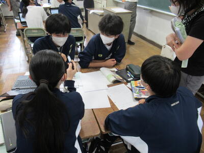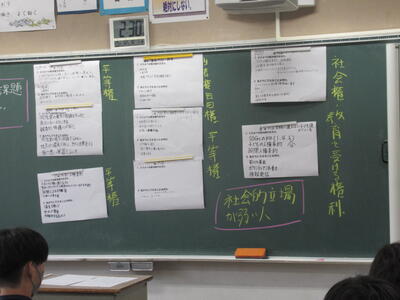 10月2日(水)5校時、3年2組社会の授業を参観しました。今日の学習は、国際社会の人権上の課題を解決する手立てを考え、発表する内容でした。生徒達は、ジェンダーの問題、人種差別、スーダンの民族紛争、ウイグル地区の人権問題、学校に通えない子どもなど、様々な国際問題を取り上げ、その解決方法や自分たちにできることについて真剣に協議していました。国際社会の人権上の課題は身近なものであり、自分事としてしっかり捉えることで、より学習が深まりました。