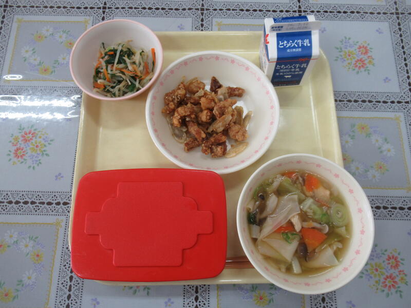 2月27日(金)、今日の給食のメニューは「ごはん、牛乳、豚肉とごぼうのかりん揚げ、にらともやしのナムル、プチプチもち麦とワンタンスープ」です。このメニューは、3年生(3年3組)がリクエスト給食として、12月に考えたオリジナルレシピのメニューです。3年生最後のリクエスト給食の味はいかがでしたか?それにしても見るからに美味しそうですね。3年生の皆さん、ご馳走様です!