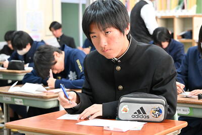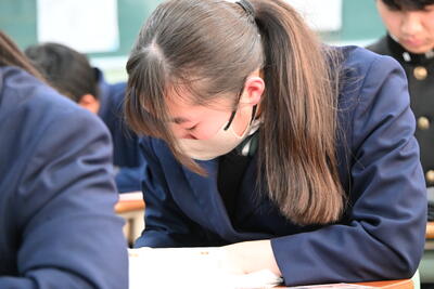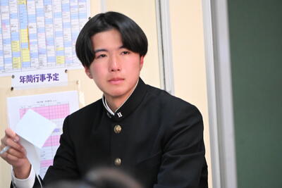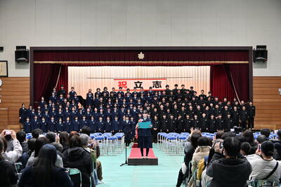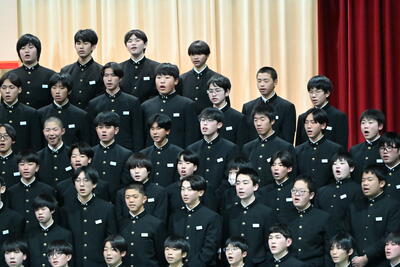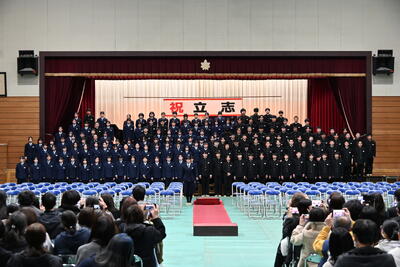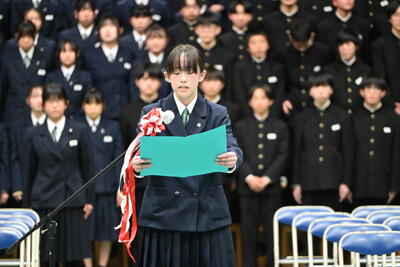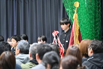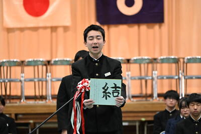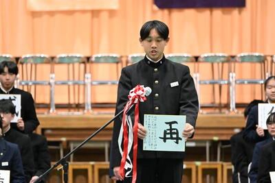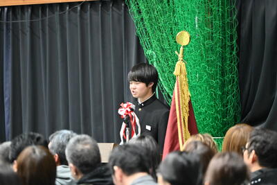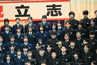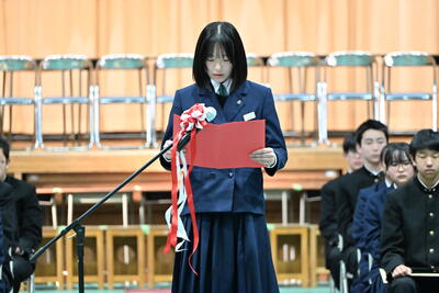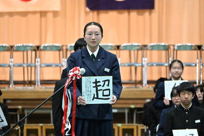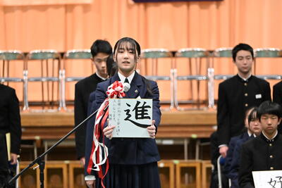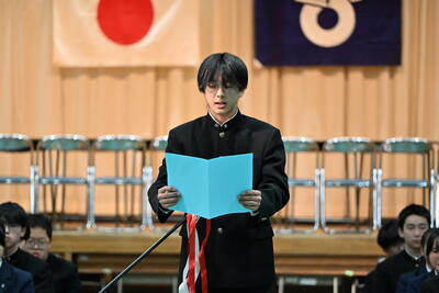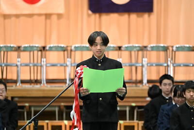 1月19日(月)、第2学年生徒、保護者、関係職員が参列し、立志式を行いました。立志式実行委員長あいさつ、校長式辞、県知事からのお祝いのメッセ―ジ、立志記念品の贈呈、代表生徒による作文発表、全生徒による誓いの言葉、記念合唱など盛りだくさんの内容でした。特に、全生徒による誓いの言葉は、一人一人の思いを漢字一文字に表し、それぞれの立式に向けた誓いを生の声で堂々と発表する姿に感動しました。また、2年生全生徒で歌った記念合唱「超えてゆけ」では、素敵な歌詞と素敵なメロディーが体育館いっぱいに広がり、2学年全員の迫力ある歌声で、聴いていた保護者や職員にしっかりと想いを届けました。そして、2学年生徒にサプライズ企画として披露した生まれたときから、これまでの生い立ちをまとめた写真のスライドショーでは、懐かしい写真と共に添えられた暖かいメッセージに、感動の涙が自然とあふれる場面が多くあり、参列した方々の感動を呼びました。スライドショーの中に、親からのメッセージに添えられた「元気に生まれてきてくれて、ありがとう」の言葉に、自然と涙を拭いている保護者がとても印象的でした。