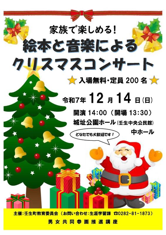 令和7年12月14日(日)壬生中央公民館(城址公園ホール)中ホールにて、「絵本と音楽によるクリスマスコンサート」を開催します。