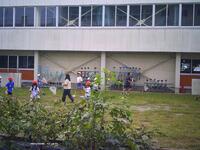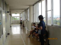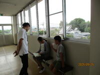 男子たちが、集まっています。何を見ているでしょう? 体育館北側の草むらに、バッタがたくさんいて、学年を超えてたくさんの児童が追いかけています。期間限定の、素敵な遊びです。