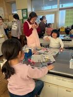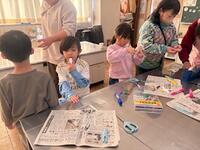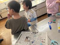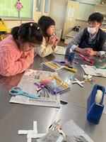 1年生は、牛乳パックなどの厚紙を細く切ったものを使って、笛とブーメラン作り。笛は、なるまでのコツがつかめず苦戦。高く綺麗な音が響きます。