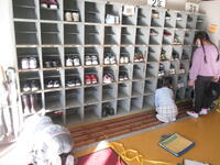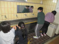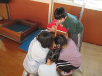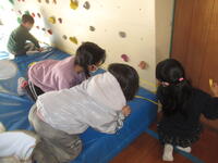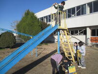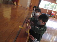 子供たちからは、「体育館のステージやすべり台を測りたい!」という意見が出ました。そこで、紙テープで3mの手作りものさしを作り、寒さに負けず、校庭や体育館に出発!
