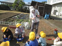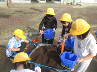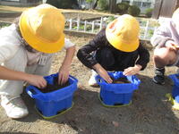 「土はチューリップのお布団だよ。やさしくふんわりかけてあげようね」と声をかけると、子どもたちは「もう寝ちゃったかな?」「温かいかな」などと優しい言葉をかけながら、丁寧に土をかけていました。