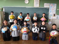 宇都宮や下野に伝わる伝説の鬼、百目鬼(どうめき)をイメージしたお面は迫力満点。カラフルで、目も口も大きく、飾っておくだけで魔除けになります。このお面は来賓玄関に飾り、一年間、藤井小を守ってもらうことになります。