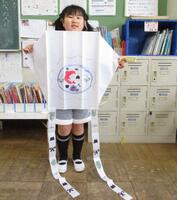 宇都宮や下野に伝わる伝説の鬼、百目鬼(どうめき)をイメージしたお面は迫力満点。カラフルで、目も口も大きく、飾っておくだけで魔除けになります。このお面は来賓玄関に飾り、一年間、藤井小を守ってもらうことになります。