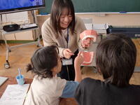 学級活動の時間に担任と養護教諭による「歯磨き指導」を行いました。1年生は、親子で歯磨き教室を実施しましたので、今回は、2~6年生を対象に実施しています。染め出しをした後に、赤く染まったところが磨き残しがある歯だと知ると驚いた様子で、鏡をよく覗き込みながら、歯磨きをしていました。歯ブラシの毛先が開いているために、よく磨けていない児童もいました。ご家庭で確認して、毛先が整っているものを持たせていただくようにお願いします。