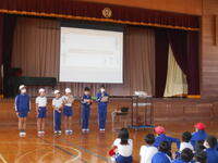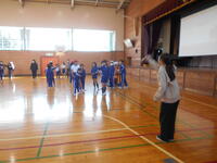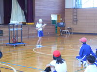 最初には、運動委員会の児童が8の字跳びのやり方を実演。「前の人が跳んだらすぐに中に入ること」「縄の真ん中を見て跳ぶこと」など、スムーズに跳ぶためのポイントを分かりやすく紹介してくれました。