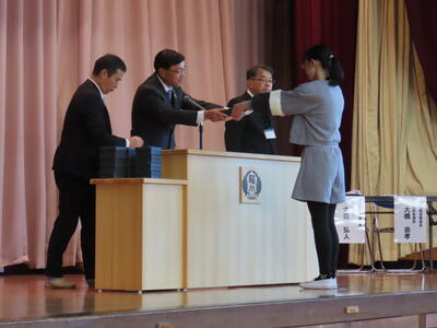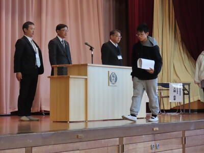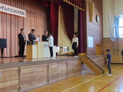 子供たちは緊張しながらも、教育長様から賞状と記念品(賞の名称が刻まれたペーパーウェイト)を立派な態度で受け取りました。