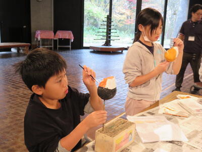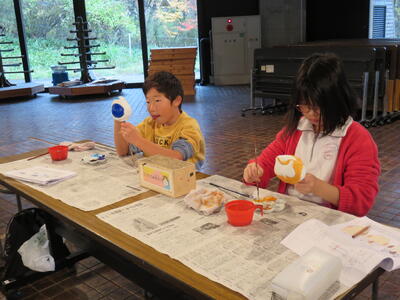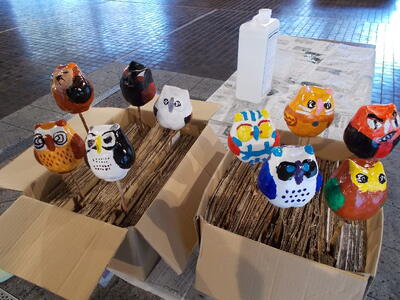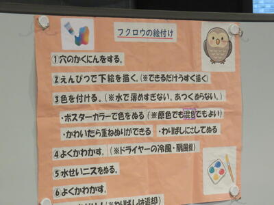 午前中はふくろうの絵付けです。考えてきたデザイン画を見ながら、真剣に絵付けをしていました。