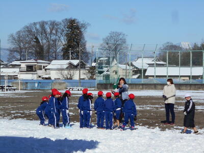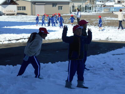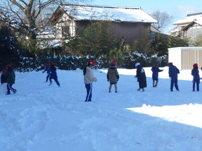 学校のあちこちには、昨日降った雪がまだ残っています。そんな中、2時間目には低学年の児童たちが体育と生活科の学習を兼ねて、校庭で「雪遊び」を行いました。