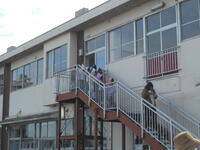 次に、学校の敷地内にある防災備蓄倉庫を見学させていただきました。住民の方々が避難されてきた際に必要となる、さまざまな備品が保管されていることを知り、地域の防災拠点としての役割を理解することができました。