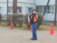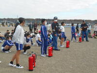 最後に6年生が、初期消火の要となる消火器の正しい使い方について指導を受け、実技訓練を行いました。