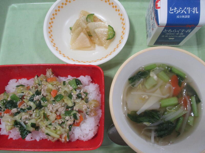 給食週間3日目は、宇都宮市のご当地料理をいただきました。献立は、セルフぎょうざ風あんかけどんぶり、だいこんのちゅうかづけ、ワンタンスープ、牛乳でした。宇都宮市は、栃木県の中央部に位置し、餃子の街・ジャズの街としても有名です。「ぎょうざ風あんかけ」は、にらやきゃべつなど宇都宮市産の野菜を使った「地産地消メニュー」として宇都宮大学と宇都宮市で共同開発された献立です。きのこやとりがらスープのうまみ、酢の酸味、ごま油の風味により薄味でもおいしく食べられるように工夫されていました。JAしもつけさんからいただいた壬生町産の“にら”と 壬生町産のきゃべつで作られたそうです。給食では、ごはんにかけておいしくいただきました。2年生をはじめ多くの子供たちがおいしそうに食べていました。