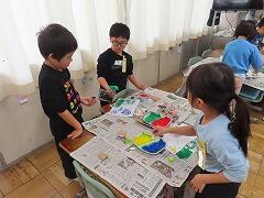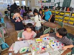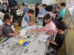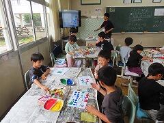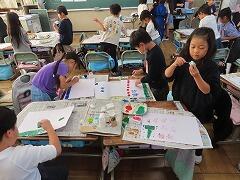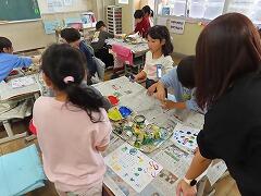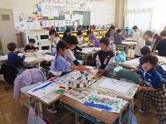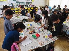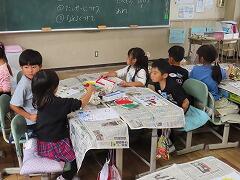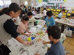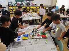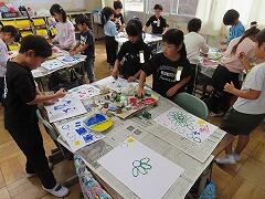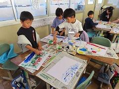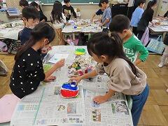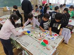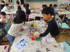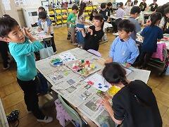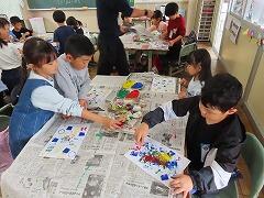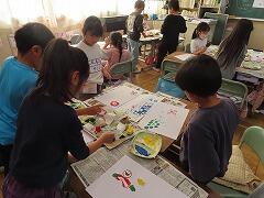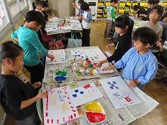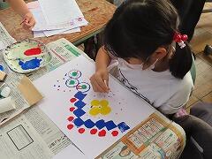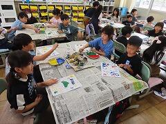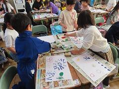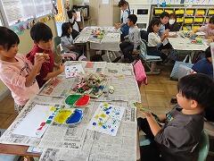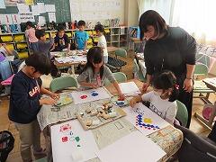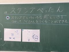 1年生の教室をのぞいてみると、図工「スタンプぺったん」の学習で、身近な材料を使ってぺったんぺったんと楽しそうにスタンプを押して、すてきな作品を作っていました。みんな友達にも見せ合いながら、笑顔いっぱい楽しそうに活動していました。