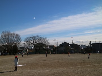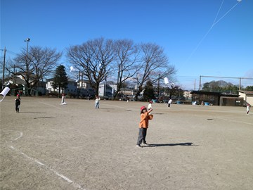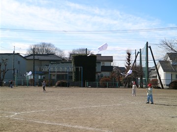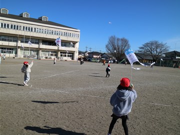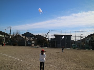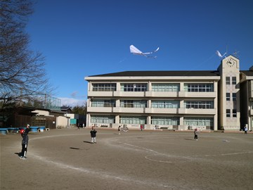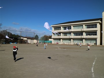 3時間目に、1年1組が校庭で凧上げをしていました。生活科の昔遊びの学習の一環です。今日は、澄み切った青空で風も凧上げにはちょうどよい風でした。友達どうし糸がからまないように上手に距離を取り、高くあげることができました。