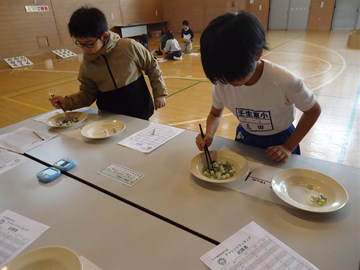 10月28日(火)の3・4校時に6年生が「カルビー朝ハロしよ!」教室を実施しました。家庭科で学習した五大栄養素の主な働きと三色食品群(黄・赤・緑)について理解を深め、バランスのよい朝食の大切さを考えることがめあてです。「次のうち、食物繊維が多く含まれている食品はどれでしょう?」というクイズでは、1位の「ブロッコリー」は予想通りでしたが、2位の「食パン」や、3位の「ご飯」は、予想外だったようで、答えが発表されると「え~っ!!」と大きなどよめきが起きました。朝食の栄養バランスを考えるよい機会となりました。