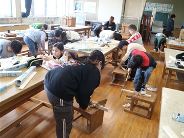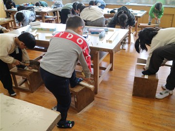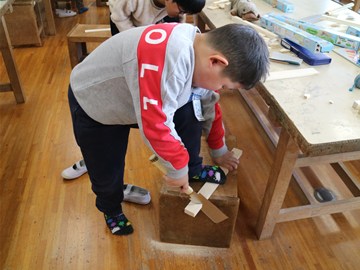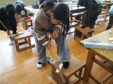 理科室の隣の図工室では、3年生がのこぎりを使って角材を切っていました。図工「のこぎりザクザク つないでつけて」の学習です。この単元では、角材をたくさんのこぎりで切り、木片を組み合わせてつくりたいものをつくる活動に取り組んでいます。どうやったら上手に切れるか、自分の頭で考えながら切ります。どんな作品ができるか、楽しみです。