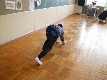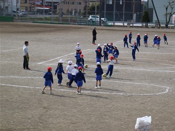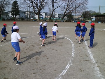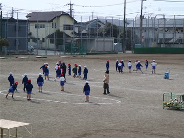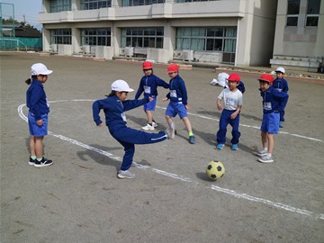 校庭では1年生が体育で「サッカー型ゲーム」の学習をしていました。幅2m長さ5mほどの楕円の内側に白チーム、楕円を挟んで外側に赤チーム。内側の白チームにボールを取られないように、楕円の反対側にいる赤チームにパスが通れば1点。赤チームは相手に取られないように、パスのコースやタイミングを考えてボールを蹴っていました。時間が来たら攻守交代です。みんな楽しそうに体を動かしていました。