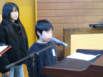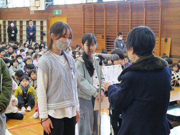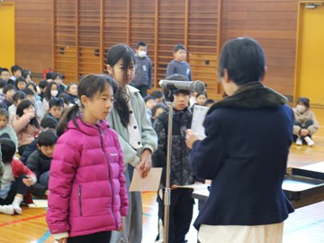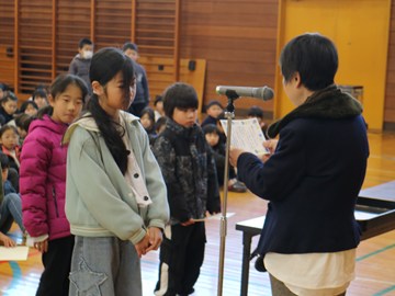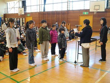 また始業式の後に「家読(うちどく)コンテスト」の表彰を行いました。本校では、本を読む楽しさを知り、家族のふれあいを通じて絆を深めることを目的に「家読(家庭読書)」に取り組んでいます 。寄せられた感想カードの中からから、学校運営協議会の皆様に各学年3点ずつ優秀な作品を選んでいただき、学校運営協議会会長より賞状を手渡しました。