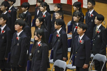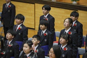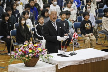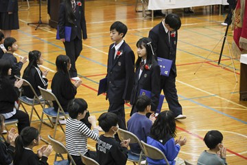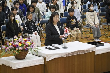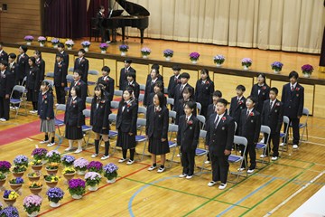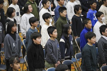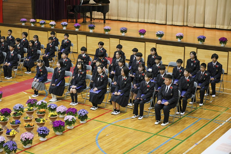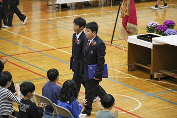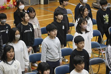 卒業生、在校生による「別れの言葉」では、修学旅行や運動会、ふれあい班活動など、共に過ごした仲間との絆が語られました。また、五年生からは、卒業生が築いた伝統を引き継ぐという決意のこもった言葉が贈られました。体育館に響き渡る卒業合唱の歌声は、参列したすべての方々の胸を打つ、素晴らしいものでした。