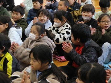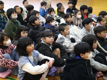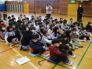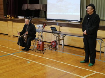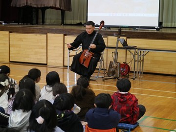 授業の後半には、物語にも登場する楽器「馬頭琴」の生演奏を聴かせていただきました。体育館に響き渡る優しく力強い音色に、子供たちは静かに聴き入っていました。また、一人で二つの声を同時に出す独特の歌唱法「ホーミー」を目の当たりにすると、その不思議な響きに圧倒されたようでした。