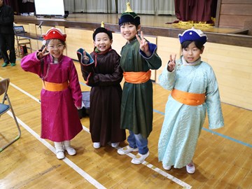 はじめに、スライドを使ってモンゴルの大自然や文化、人々の生活についてお話を伺いました。移動式住居「ゲル」での生活などについてお話を伺いました。また、代表児童が色鮮やかな民族衣装「デール」を試着させてもらう場面もあり、その独特な作りに興味津々でした。