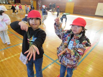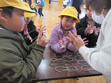 子供たちは6つのグループに分かれ、こま回し、おてだま、おはじき、竹とんぼ、あやとり、竹馬の6種類の昔遊びを7分ずつ交代で体験しました 。