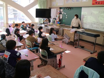 強風が吹いていたので、校長の話は教室で放送を聞く形にしました。1995年1月17日に起きた阪神・淡路大震災や2011年3月に起きた東日本大震災、さらに直近の各地の地震に触れ、日本は「地震の国」であり、自分の命を守る大切さを伝えました。ご家庭でも、寝る場所の安全確認や避難時の待ち合わせ場所について、ぜひ話題にしてみてください。