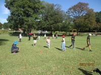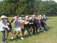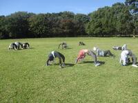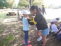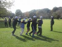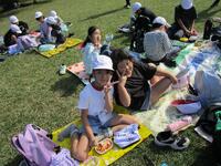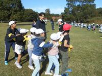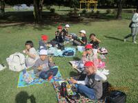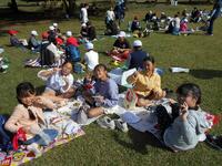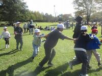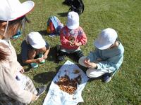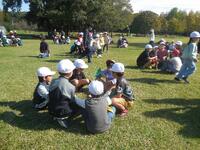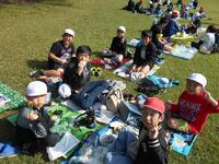 初めに、「カモーン」と「猛獣狩りゲーム」をして全員で遊びました。その後、「だるまさんの一日」「だるまさんが転んだ」や「中線ふみ」など、班ごとに決めてあった遊びをしました。いくら大きな声を出しても寝転んでもOKですので思いっきり楽しんで、早めのお弁当も待ちきれないくらいにお腹もすいたようでした。