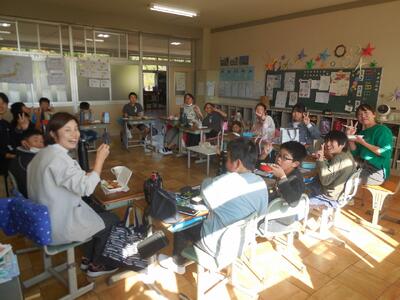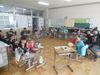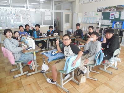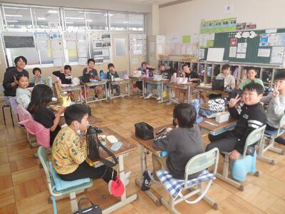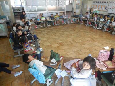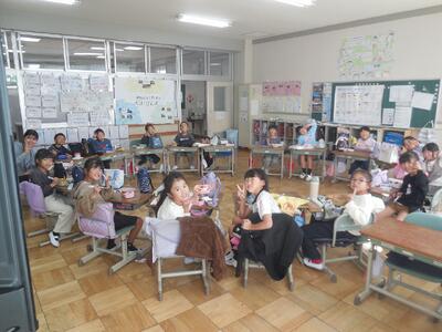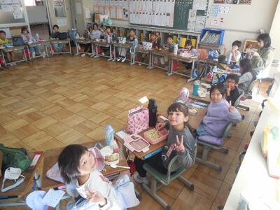 <今日のお弁当の様子です。どの学年も丸く(四角に?)なってみんなで向き合って食べていました>