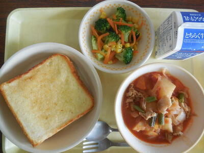 <今日の給食は、はちみつレモントーストと洋風肉じゃが、ブロッコリーとにんじんのサラダです>