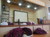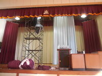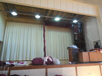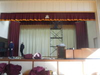 体育館の緞帳ですが、経年劣化のため夏休み中に大きく破れてしまい、ほかにも破れ等の痛みが目立っていました。今日、これまでの緞帳をすっかり取り外し、新しいものを取り付けました。鮮やかな赤の色がとてもきれいです。今年の卒業式は、新しい緞帳をバックに実施することができます。