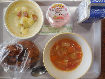 <今日の給食は、ひなまつりメニュー(セルフ五目ちらし寿司、白身魚の西京焼き、かきたま汁、ひなあられ、牛乳)でした>