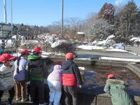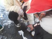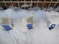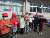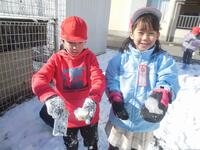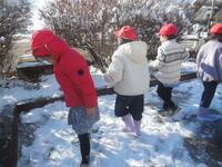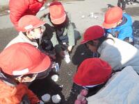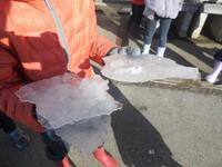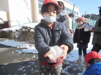 週末にたくさん雪が降り、1年生は、しっかり生活科の学習ができました。外水道や池に張った氷、植え込みに残った雪に大喜びです。金曜日の5時間目に氷づくりの準備をしておいたので、どうなっているか興味津々です。プールの裏側に置いておいた牛乳パックや給食のデザートの容器に入れた水は、すっかり立派な氷になっていました。牛乳パックをはがすと、四角い氷が出てきました。「こんなのができた!」「全部凍っている!」「中に水が入っている!」と、それぞれ担任のK先生に報告しています。雪や氷で遊べて楽しそうでした。